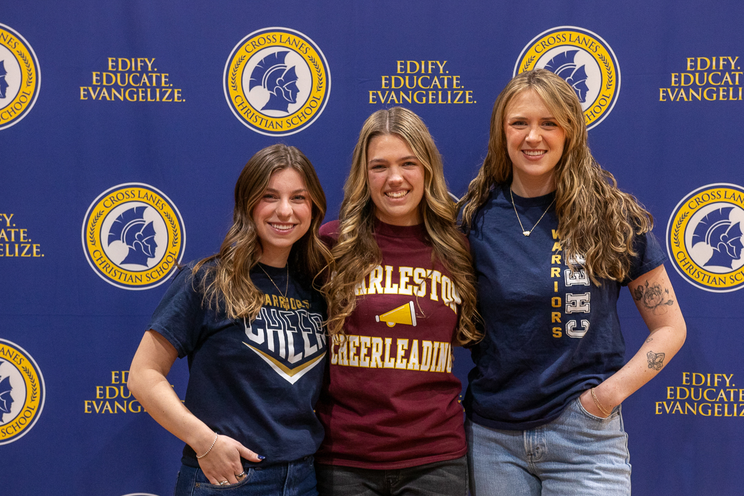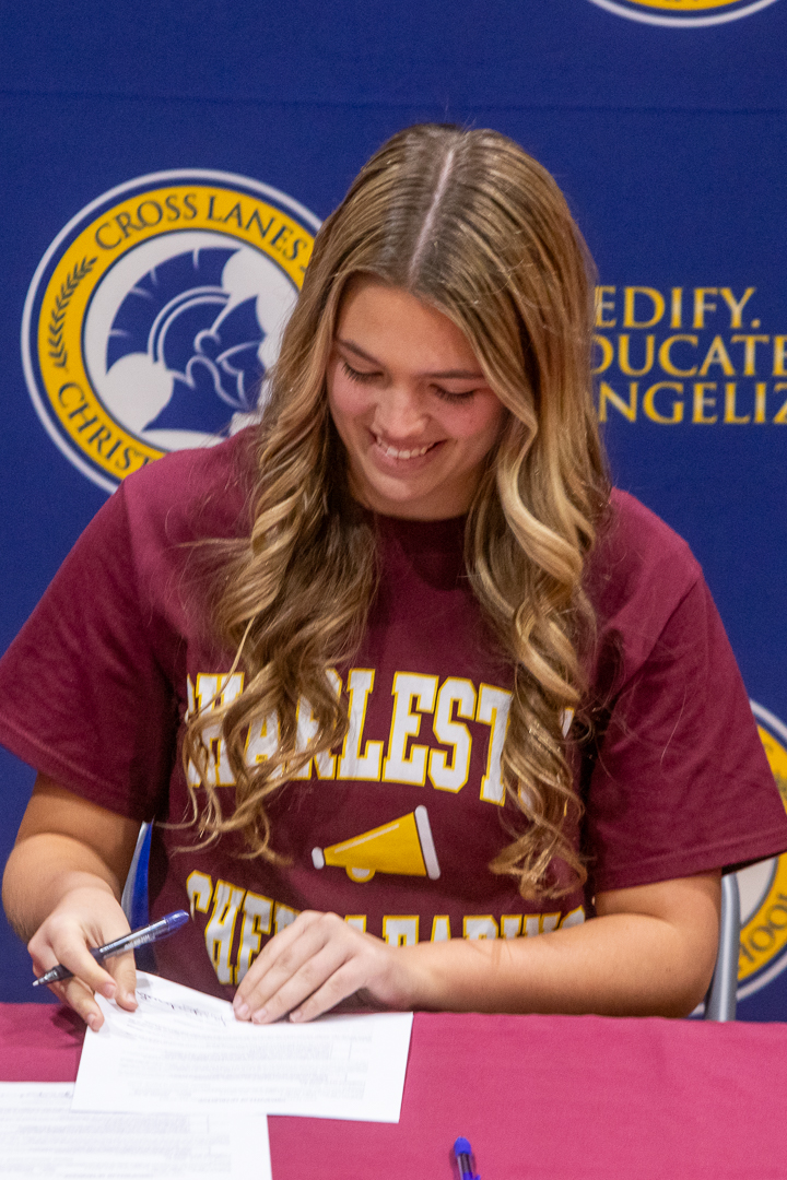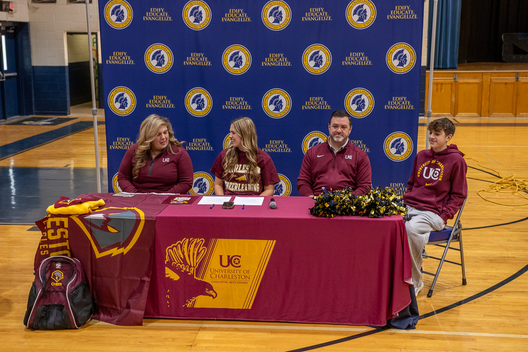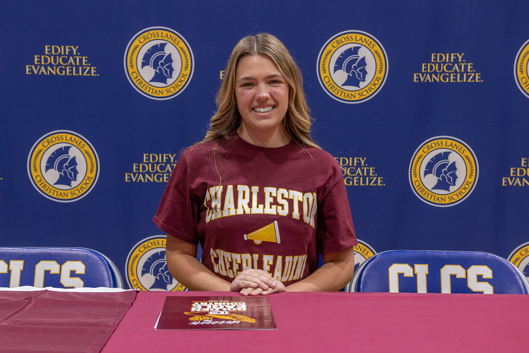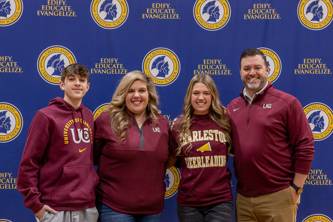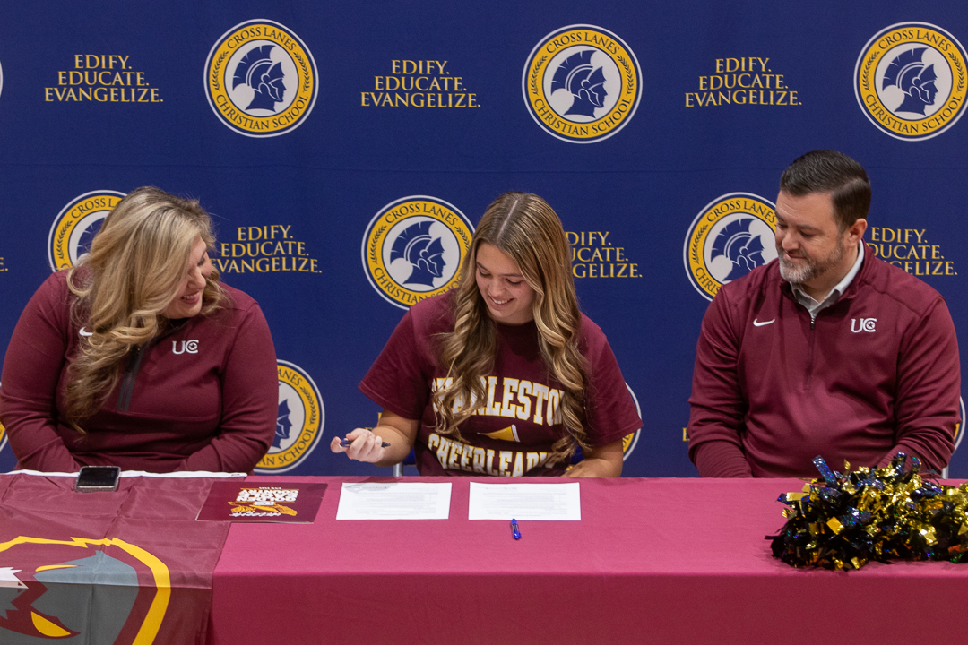 Miss Chloe Beakes, CLCS senior and daughter of Ben and Sarah Beakes, has committed to joining the University of Charleston’s cheer team! The signing ceremony took place in our school gymnasium January 8 with the student body in attendance. Chloe’s CLCS cheer coaches, Kalia Jeffrey and Aspen Gonzales, attended the ceremony. Coach Jeffrey and AD Blake Moore honored Chloe with congratulatory speeches.